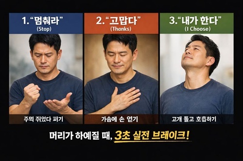 전문가들은 위기의 순간, 5단계 프로세스를 “멈춰라, 고맙다, 내가 한다”라는 세 마디 주문과 ‘신체 동작(Anchor)’으로 압축해 대응할 것을 권장합니다. 이는 뇌보다 반응이 빠른 몸의 감각을 이용해 내면 시스템을 강제로 재부팅하는 전략입니다.