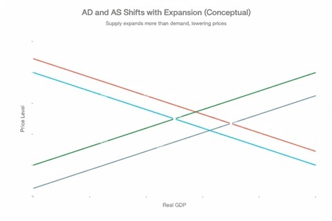 유동성 증가로 총수요가 늘어나면 AD 곡선이 우측으로 이동하지만, 동시에 AI 투자와 생산성 혁신이 이루어지면 동일한 비용으로 더 많은 재화를 생산할 수 있게 되어 총공급(AS) 곡선 역시 우측으로 이동합니다.